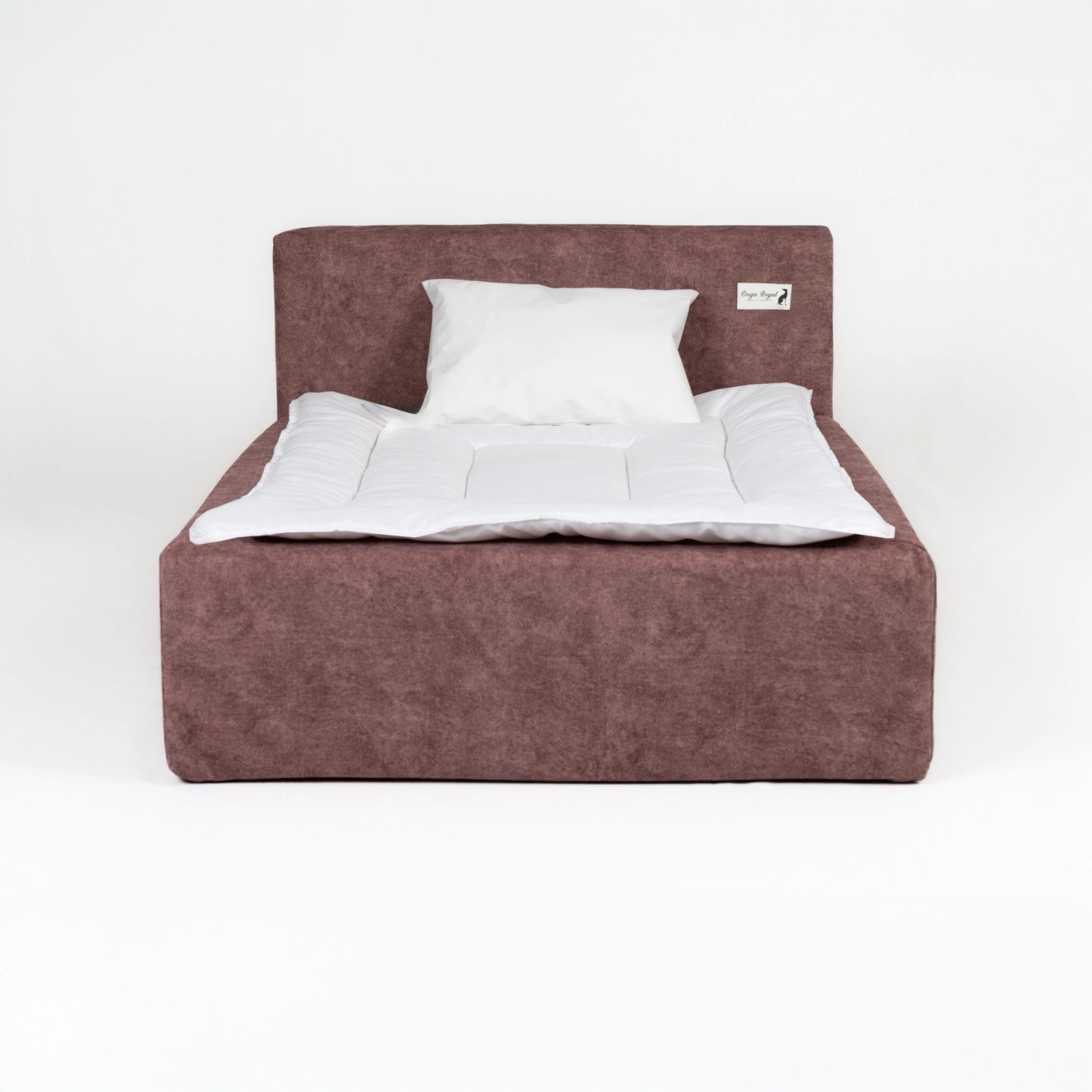 The mattress and pillow are wrapped in 100% premium cotton, a breathable, lightweight, and ultra-soft innovative cotton developed for water-resistance and natural comfort. All sheets are fully unzippable and machine washable, making it one of the most beautiful and practical luxury dog beds available.